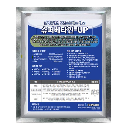 • 고온스트레스해소제 슈퍼베타인-UP(Super Betaine-UP) · 슈퍼베타인-UP은 체내 삼투압과 산염기 균형을 조절해 신진대사를 촉진하고, 식욕과 원기 회복에 도움을 줍니다. ..
